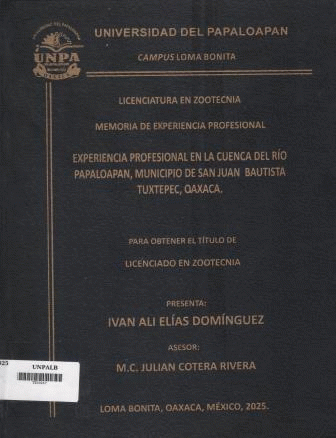 Experiencia profesional en la Cuenca del Río Papaloapan, municipio de San Juan Bautista Tuxtepec, Oaxaca / Memoria de experiencia profesional para obtener el título de Licenciado en Zootecnia, presenta Iván Alí Elías Domínguez ; asesor Julián Cotera Rivera